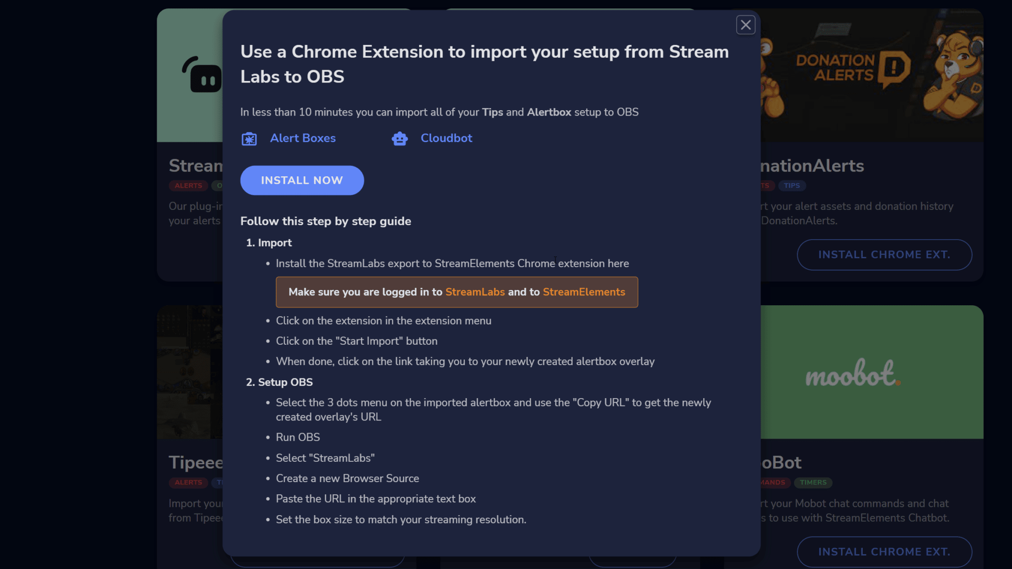 Install Nowand then head over to Streamlabs. - Open the extension and select if you want to import tips and alerts or just alerts. Click