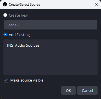 Go to each of your regular scenes (e.g. Game, Just Chatting, Starting Soon, etc.) and add a new source. Select Scene as the source type, and then select the already existing nested scene which should be named [NS] Audio Sources.