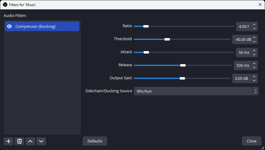 If you want to automatically lower your music volume (or any other audio source) when you speak, you can set up audio ducking or side-chaining. To do this, select your music source in OBS, add the Compressor filter, and select your microphone as the Sidechain/Ducking Source.