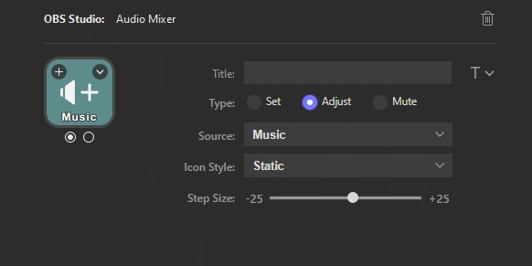 Simply add the Audio Mixer key which you’ll find under the OBS Studio category. Next, select the audio source you want to control (e.g. Music), and then select whether you want to adjust the volume up, down, or toggle mute.